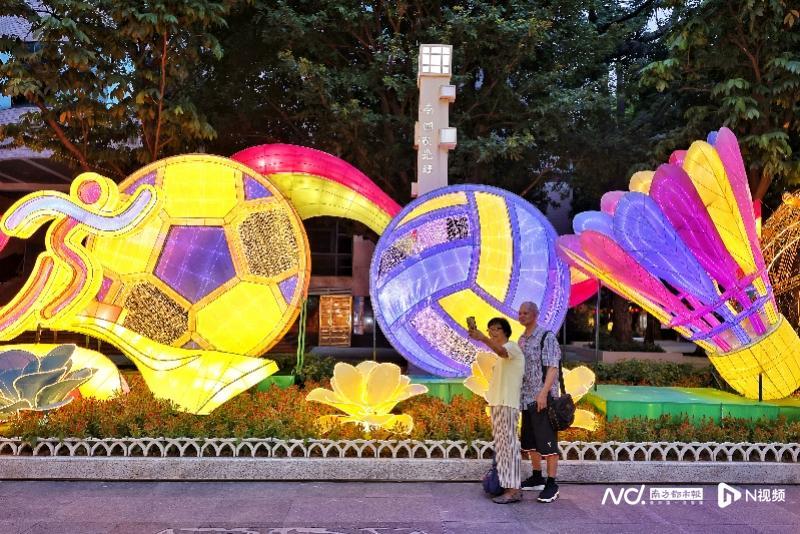 本届中秋灯会紧扣“喜迎十五运”主题,以《乘风破浪海天阔》为核心灯组,通过彩灯扎作工艺与现代灯光技术,呈现运动节奏与光影律动的视觉盛宴。