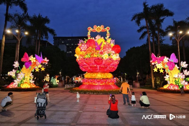 公园中心广场上,一个古典大花篮造型强力吸睛。灯组以鲜花与岭南佳果为创作主体,延续中式彩灯的典雅气韵,又以饱满的意象传递出双重美好寓意,璀璨夺目,令人驻足赞叹。灯组高达10米,彩灯匠人们采用“扎架塑形”的扎作工艺,将花篮的弧度、花瓣的层次、瓜果的轮廓扎作得精准细腻。